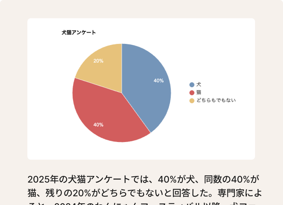 グラフ付きの記事のイメージ図。犬猫アンケートというタイトルの円グラフには、犬・猫・どちらでもない3つのデータが有る。それぞれ、40,40,20%だ。下には本文でグラフの説明が続く。2025年の犬猫アンケートでは、40%が犬、同数の40%が猫、残りの20%がどちらでもないと回答した。と書かれている。