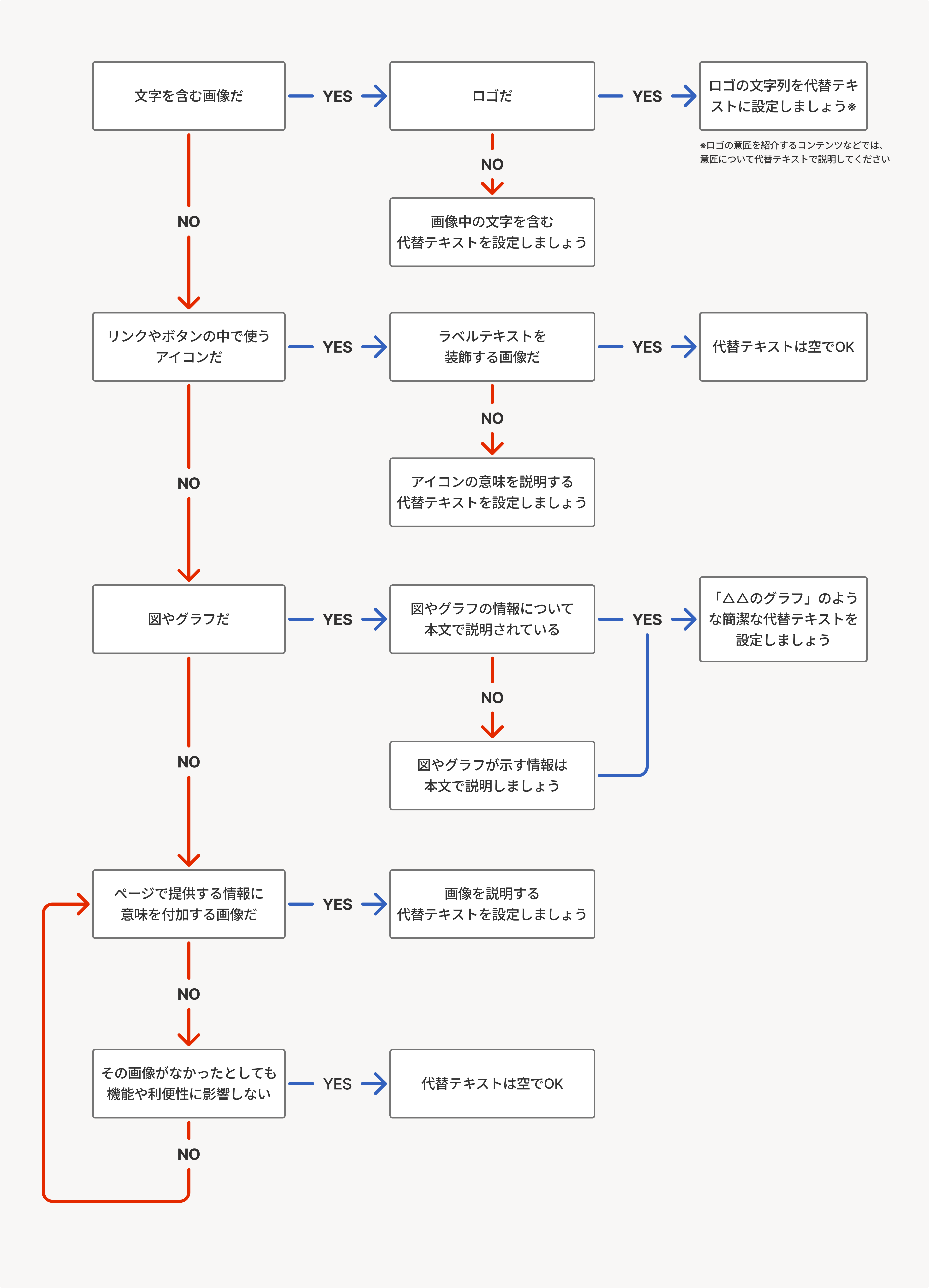 • いいえ: 画像中の文字を含む説明を代替テキストに設定しましょう