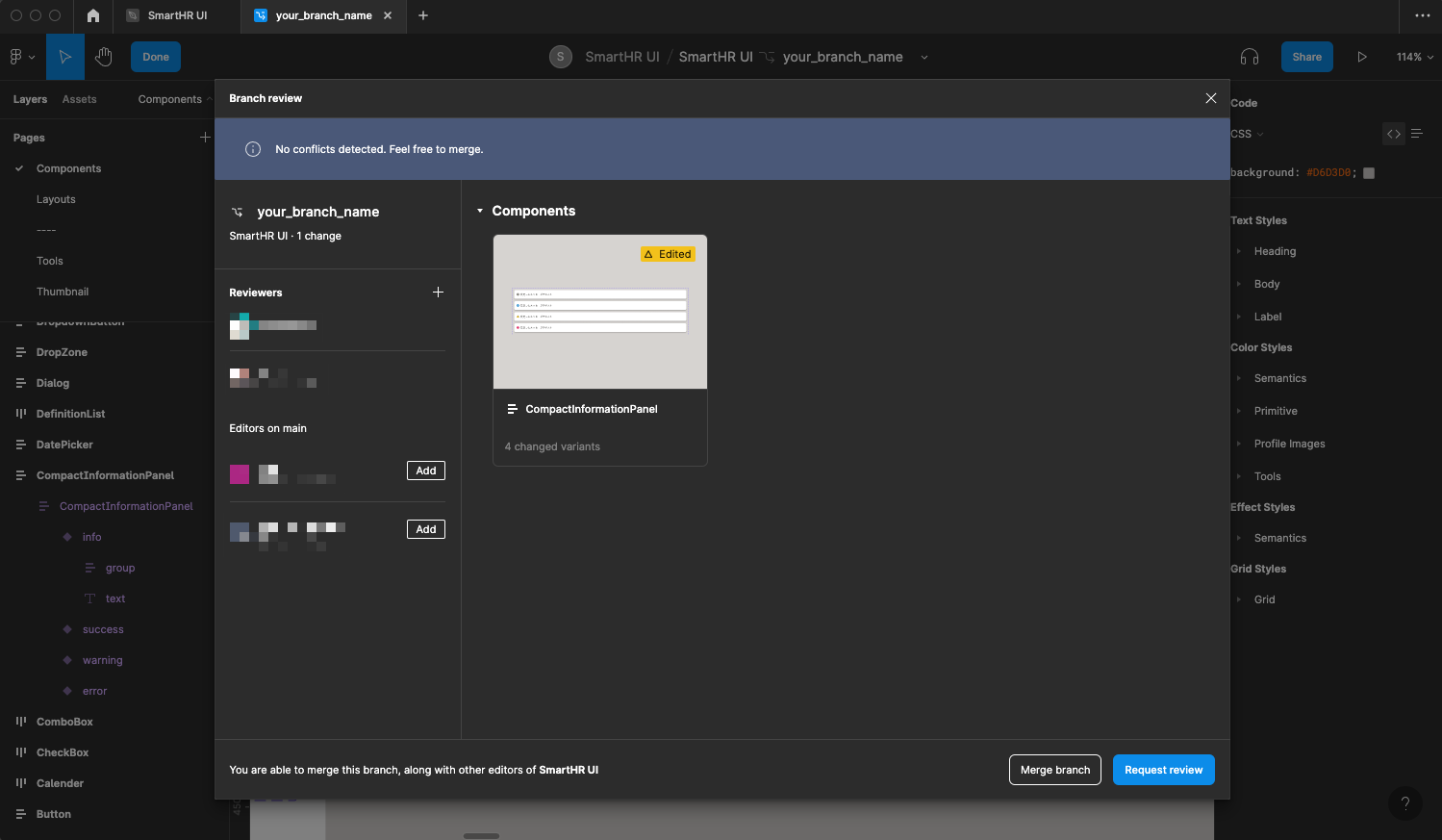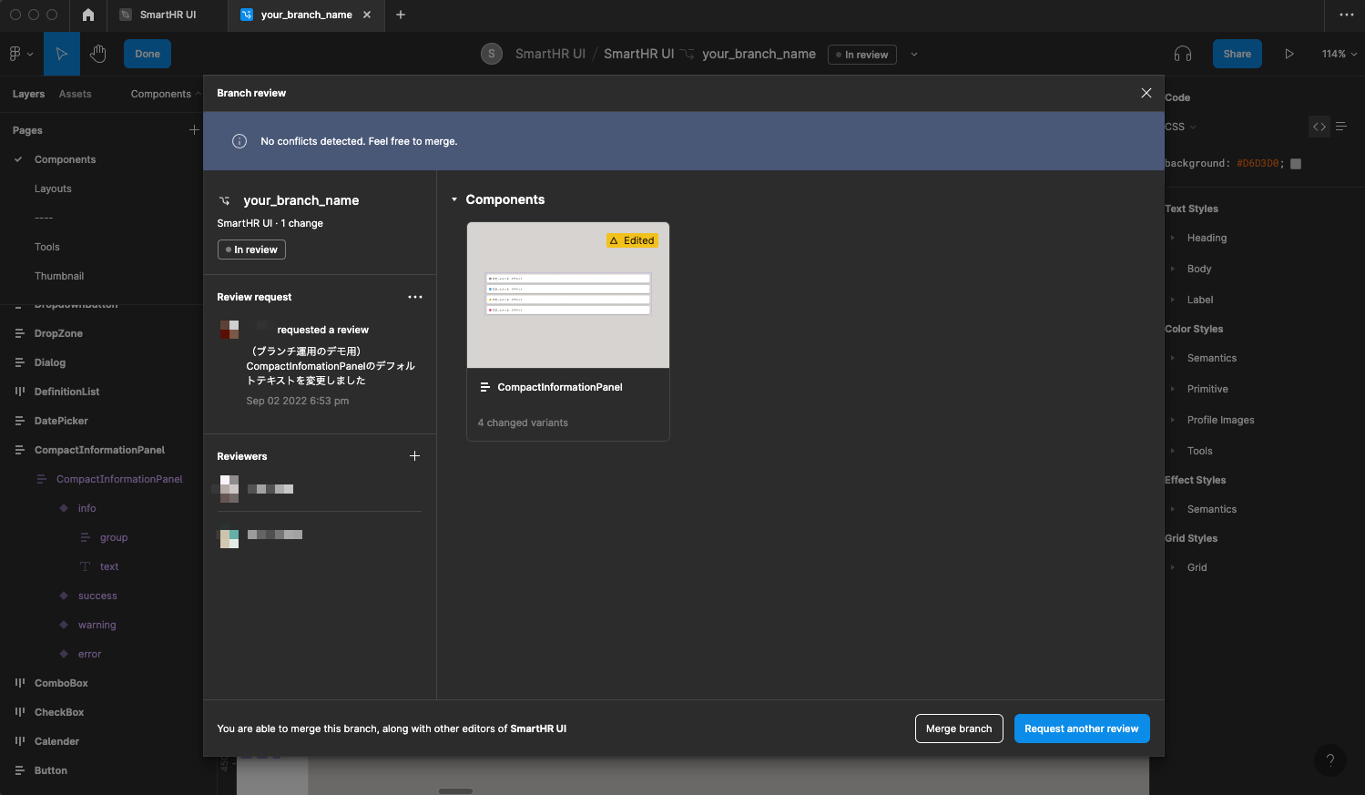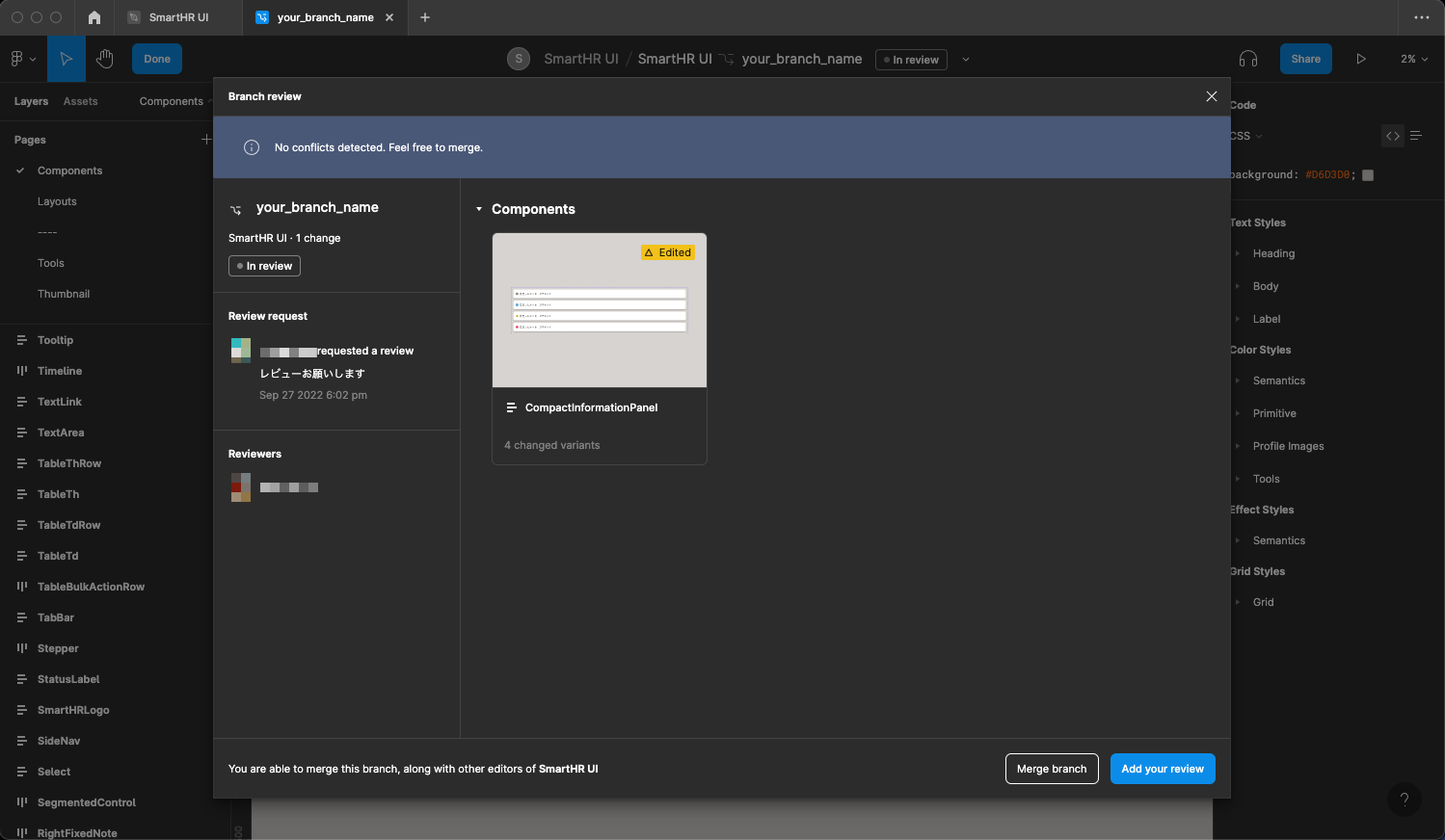 SmartHR UIに変更を加える場合は、Figmaの「ブランチ機能」を利用してレビューを依頼する必要があります。 ブランチ作成時やレビュー依頼時は、以下の点に注意して作業してください。