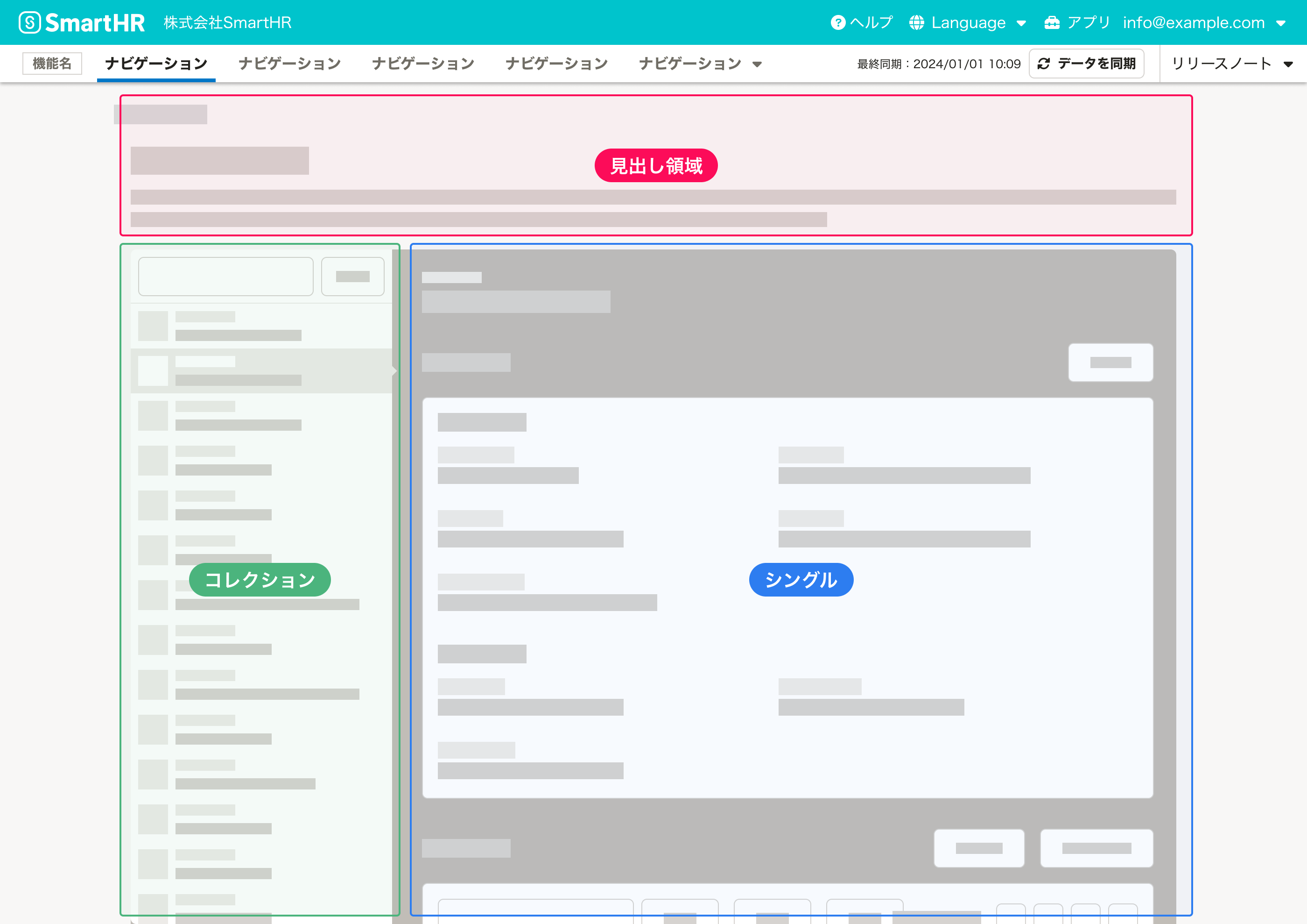 エラー画面を除き、SmartHRのページは以下の要素と領域によって構成されます。